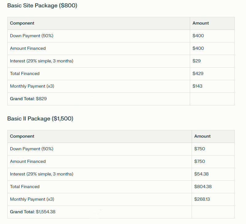 Standard Website package Financing